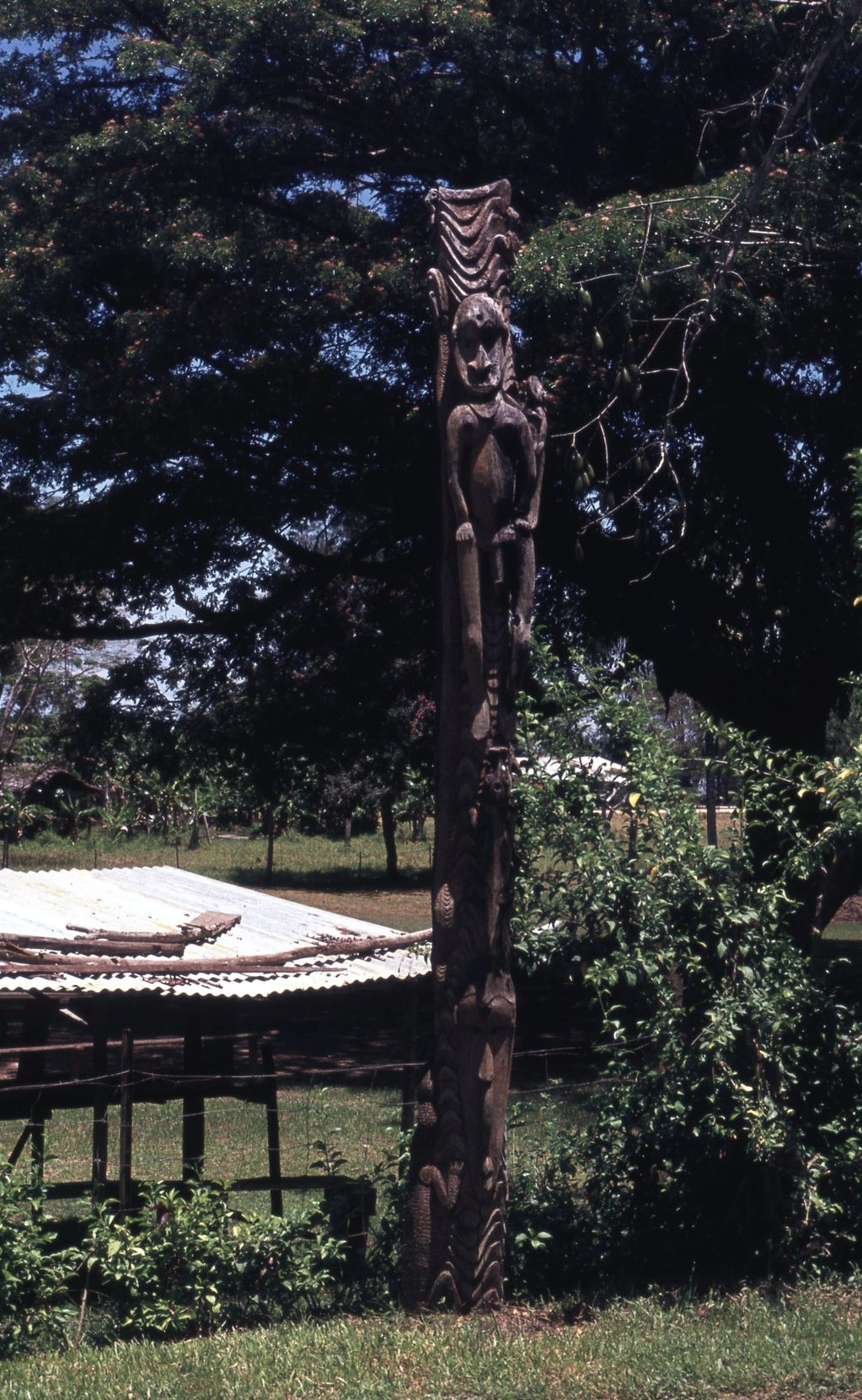 Totem pole at Haus Tambaran, Angoram, East Sepik Province, Papua New Guinea (1978).