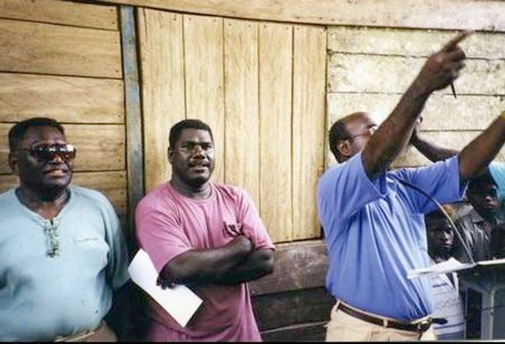 The late Sir Alexis Sarei (left), former chairman of the Bougainville Resistance Force, the late Hilary Masiria (centre) and Hon. Thomas Soagai (right) at Gagan Village, Buka, Autonomous Region of Bougainville, 1998.